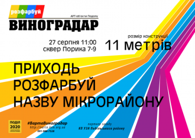 27 серпня об 11:00 відбудеться акція "Розфарбуй Виноградар" в рамках якої кожен зможе власноруч створити витвір мистецтва, який згодом розміститься на в'їзді до мікрорайону! Як повідомляють організатори, висота кожної літери - 1,5 м, ширина - 0,75 м, кількість букв - 20, довжина конструкції - 11 м.