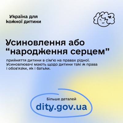 - Усиновлення або “народження серцем” — прийняття дитини в сім’ю на правах рідної. Усиновлювачі мають такі ж права й обовʼязки щодо дитини, як і батьки.