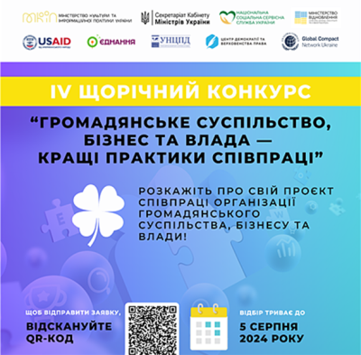 Проєкт «Ініціатива секторальної підтримки громадянського суспільства України» спільно з Міністерством культури та інформаційної політики України, Секретаріатом Кабінету Міністрів України, Міністерством розвитку громад, територій та інфраструктури України, Національною соціальною сервісною службою України та Глобальним договором ООН в Україні запускає IV щорічний Конкурс історій «Громадянське суспільство, бізнес та влада – кращі практики співпраці».