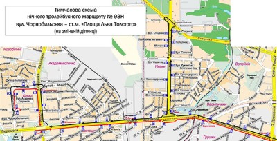 Тролейбуси маршруту № 93Н курсуватимуть у напрямку вул. Чорнобильської від ст. м «Площа Льва Толстого» до просп. Перемоги за діючим маршрутом, далі так: вул. Данила Щербаківського (розворот на Інтернаціональній площі) – просп. Перемоги – просп. Академіка Палладіна – б-р Академіка Вернадського – вул. Академіка Єфремова – вул. Чорнобильська – вул. Ірпінська.