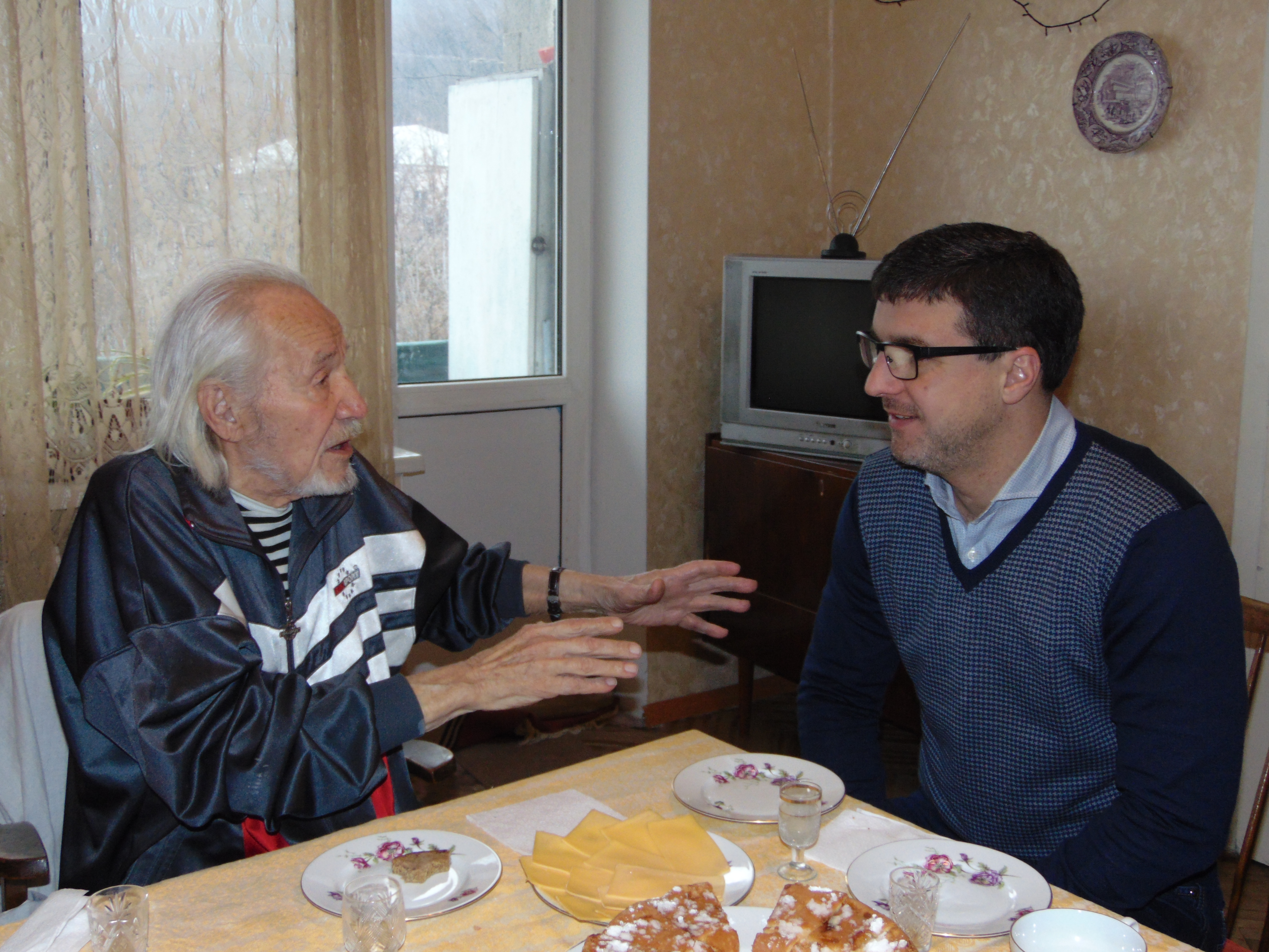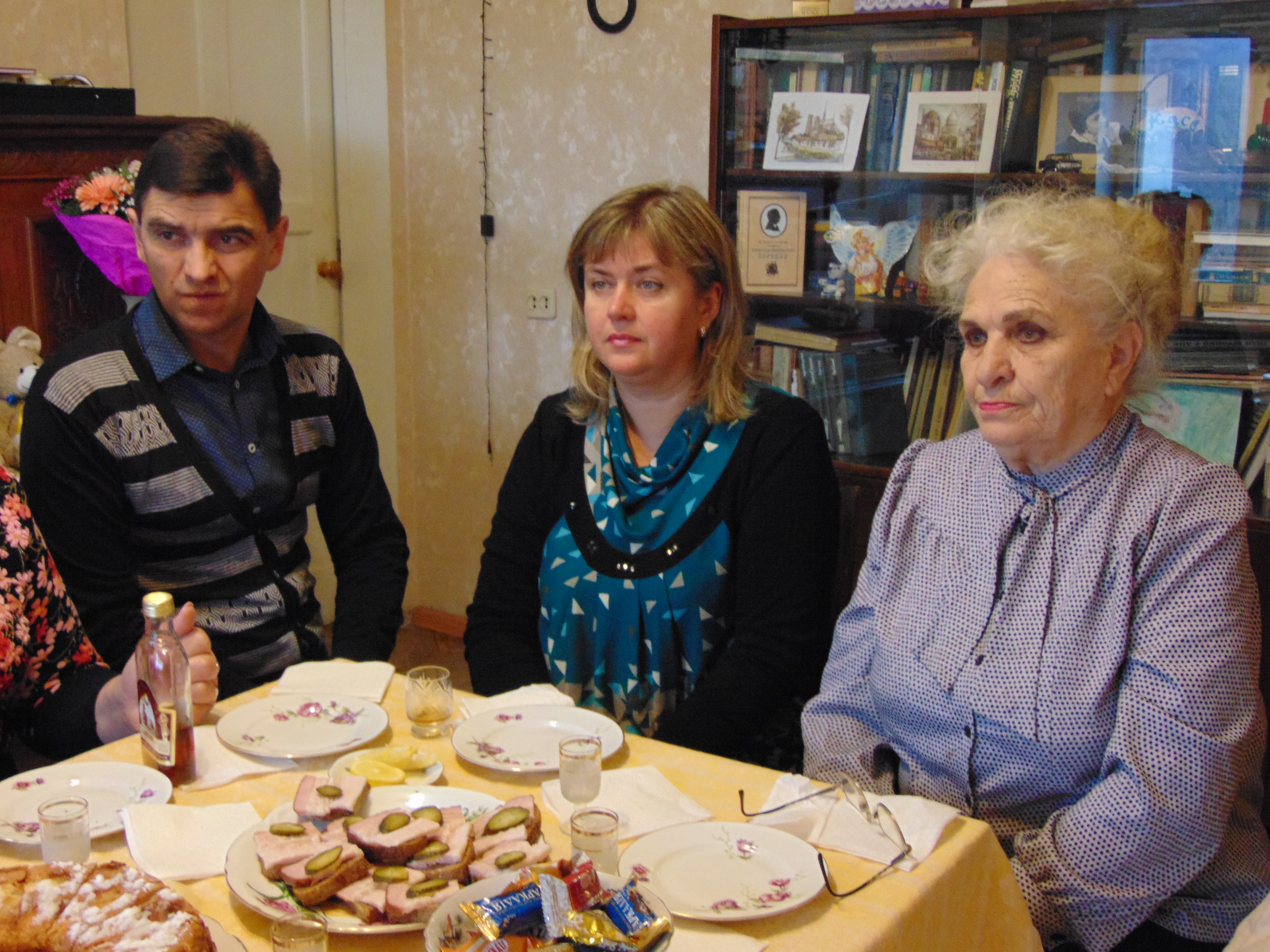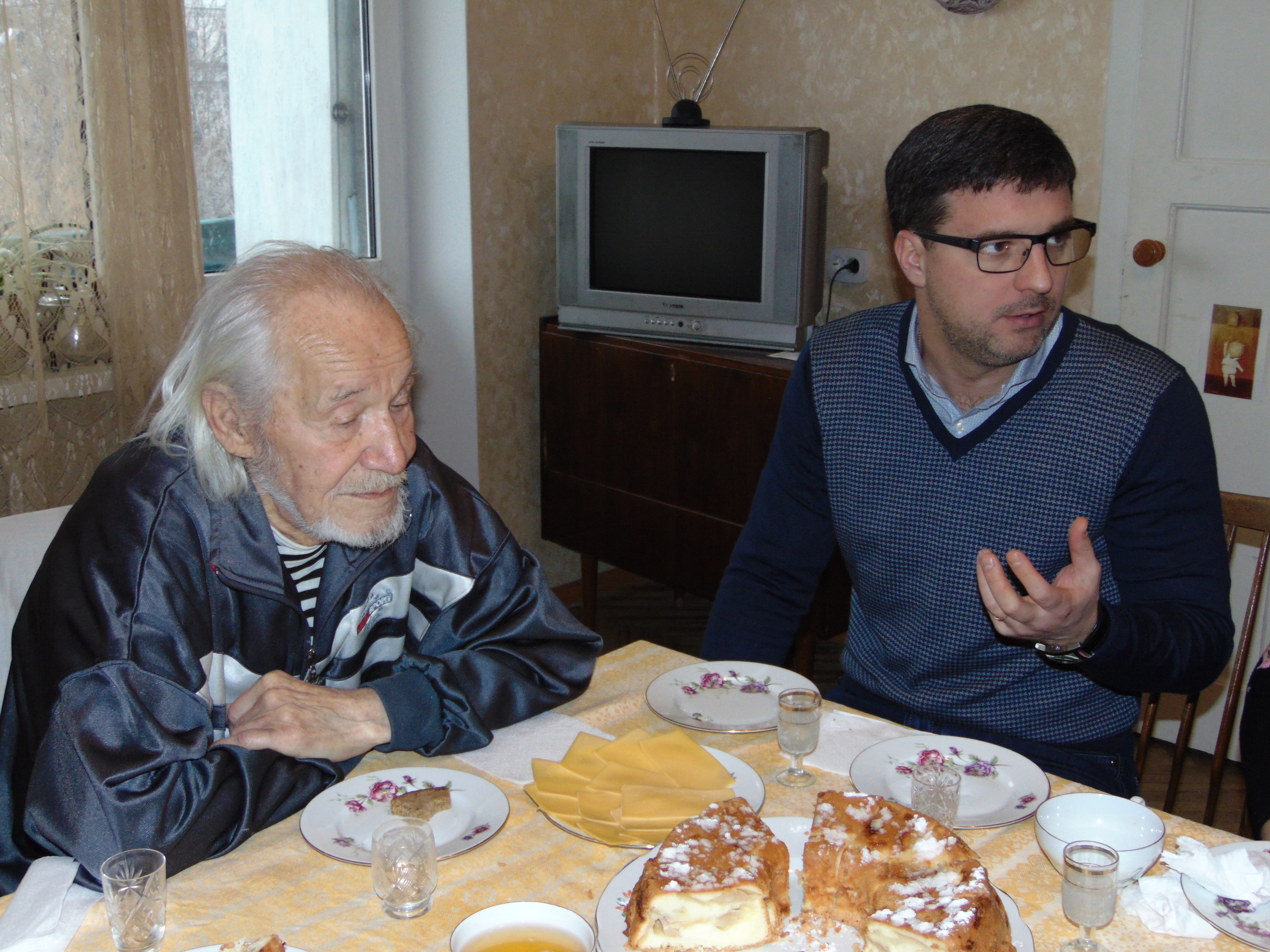 Після офіційного вручення подарунків, вітальних листівок і фото на пам’ять, Анатолій Григорович запросив гостей до столу, зауваживши, що за усіма інгредієнтами для святкового пирога, який спекла внучка, в магазин він ходив особисто. Відтак, Анатолій Григорович розповів, як після війни школярем висаджував дерева на Трухановому острові, бо острів було повністю спалено, як відновлював з друзями Дніпровський річковий флот, як раділи кожному новому кораблю, котрий приписувався до флотилії, як відкривали нові вантажно-пасажирські маршрути, і яку роль зіграла флотилія у забезпеченні ліквідації наслідків аварії на Чорнобильській атомній електростанції.