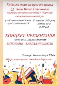 У Києві, 23 вересня 2024 року, у Київській дитячій музичній школі №1 імені Якова Степового відбудеться концерт-презентація музичних інструментів.