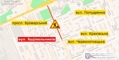 На вул. Будівельників частково обмежать рух із 22:00 8 серпня до 6:00 9 серпня. Про це повідомили у КК «Київавтодор».