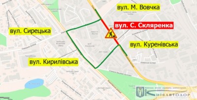 На вул. С. Скляренка обмежать рух із 23:00 10 серпня до 7:00 11 серпня. Про це повідомили у КК «Київавтодор».