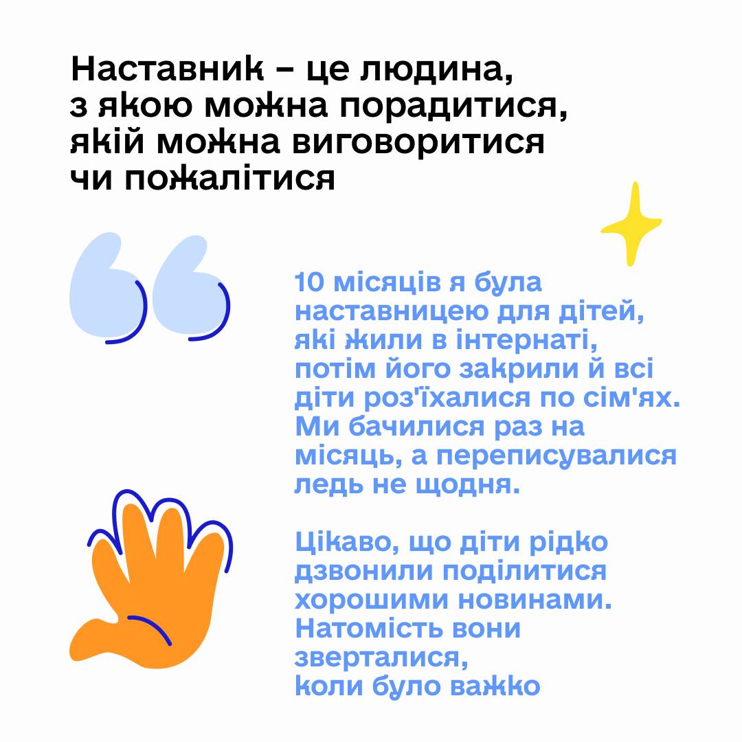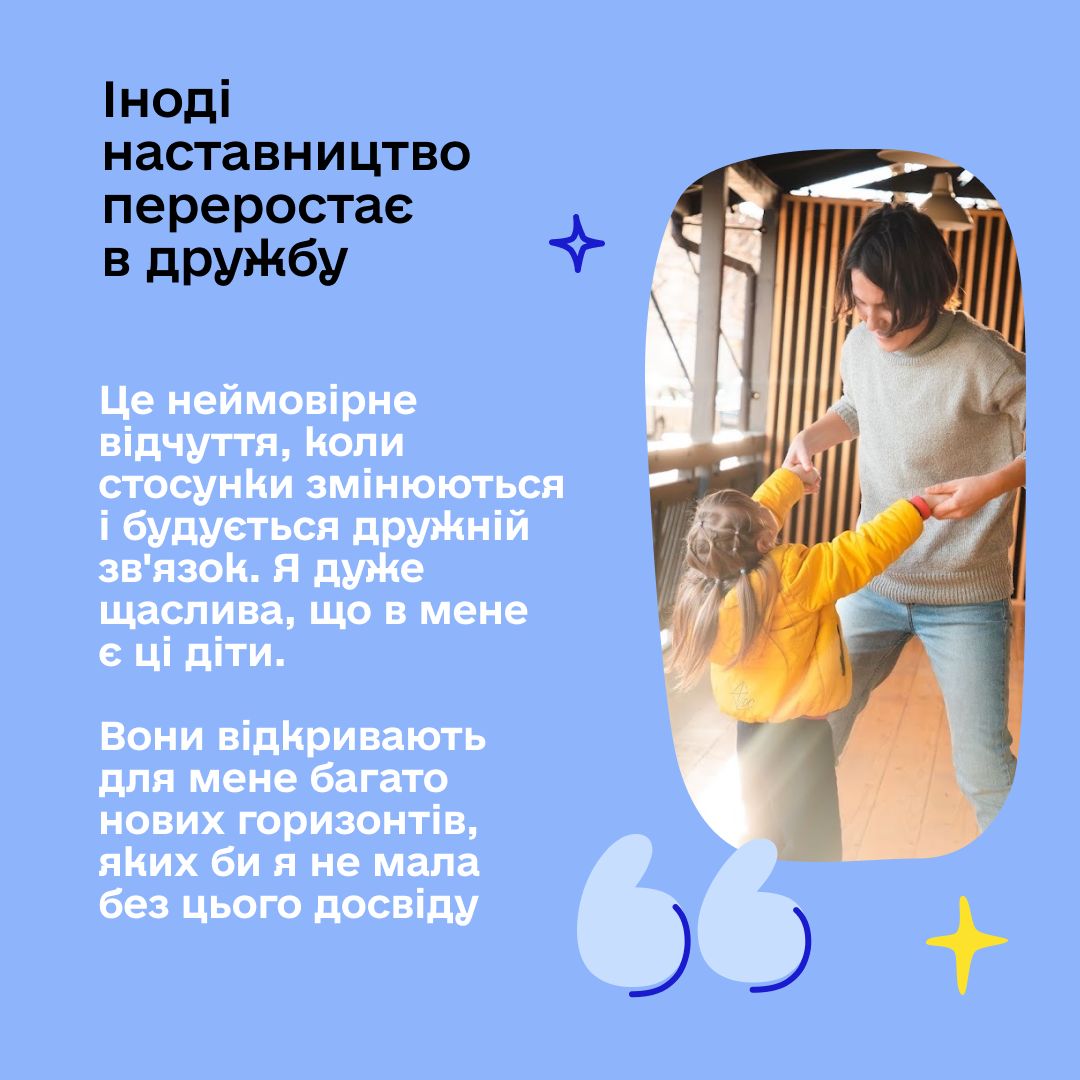 Щоб стати наставником, не потрібно мати багато вільного часу чи суперздібності. Потрібно просто мати бажання допомогти, пройти навчання і стати опорою для дитини, яка цього потребує.