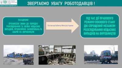 Під час дії правового режиму воєнного стану діє спрощений механізм розслідування нещасних випадків на виробництві. Він дає можливість швидше проводити розслідування та створити відповідні умови для своєчасного та належного соціального захисту потерпілих. В теперішніх умовах ця робота є пріоритетним завданням профілактики страхових випадків.