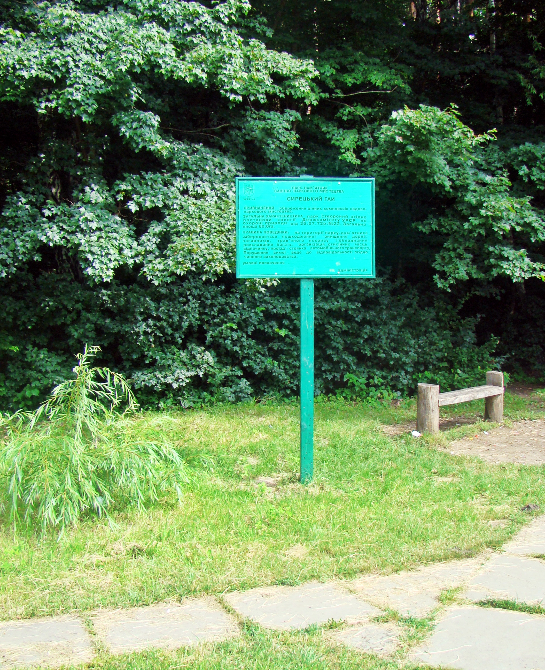 Слід зазначити, що Громадською ініціативою «Збережемо Сирецький гай» встановлено природоохоронний знак, інформаційна таблиця про парк-пам’ятку садово - паркового мистецтва «Сирецький гай».