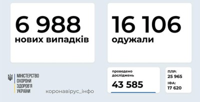За даними Центру громадського здоров’я, станом на 29 грудня в Україні зафіксовано 6 988 нових підтверджених випадків коронавірусної хвороби COVID-19 (з них дітей – 324, медпрацівників – 337). Кількість активних хворих становить 337 446 осіб.