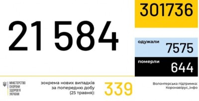 За даними ЦГЗ, станом на 9:00 26 травня в Україні 21584 лабораторно підтверджені випадки COVID-19, з них 644 летальні, 7575 пацієнтів одужало. За добу зафіксовано 339 нових випадків.