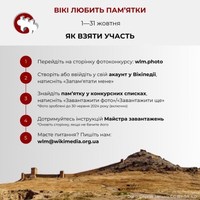 Із 1 по 31 жовтня відбудеться український етап «Вікі любить пам’ятки» — найбільшого у світі фотоконкурсу об’єктів української нерухомої культурної спадщини для Вікіпедії. Цього року він відбудеться втринадцяте.