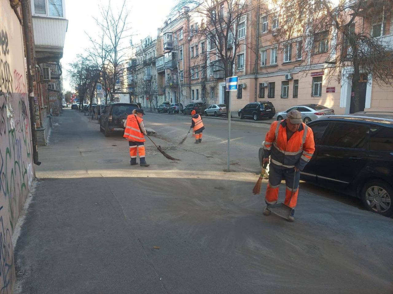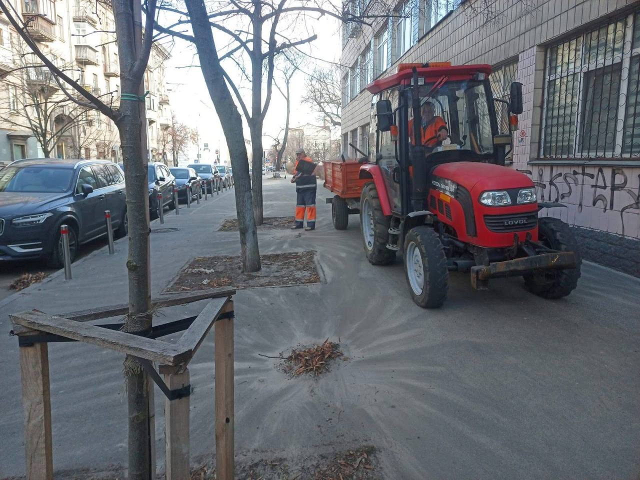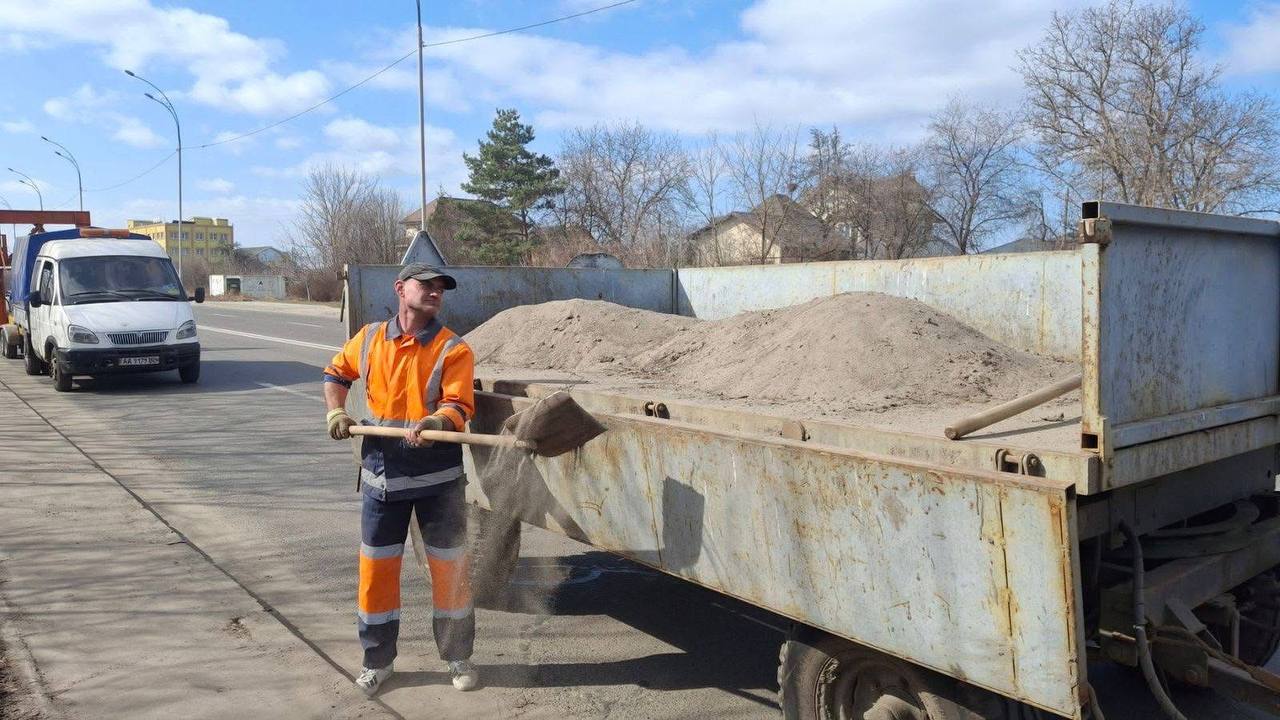 Співробітники КП ШЕУ Подільського району продовжують активно виконувати роботи з прибирання балансової території від пилу, піску та відсіву, які накопичились після зими