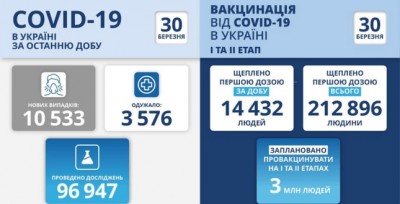 10 533 нових випадки коронавірусної хвороби COVID-19 зафіксовано в Україні станом на 30 березня 2021 року. Зокрема, захворіли 367 дітей та 250 медпрацівників.