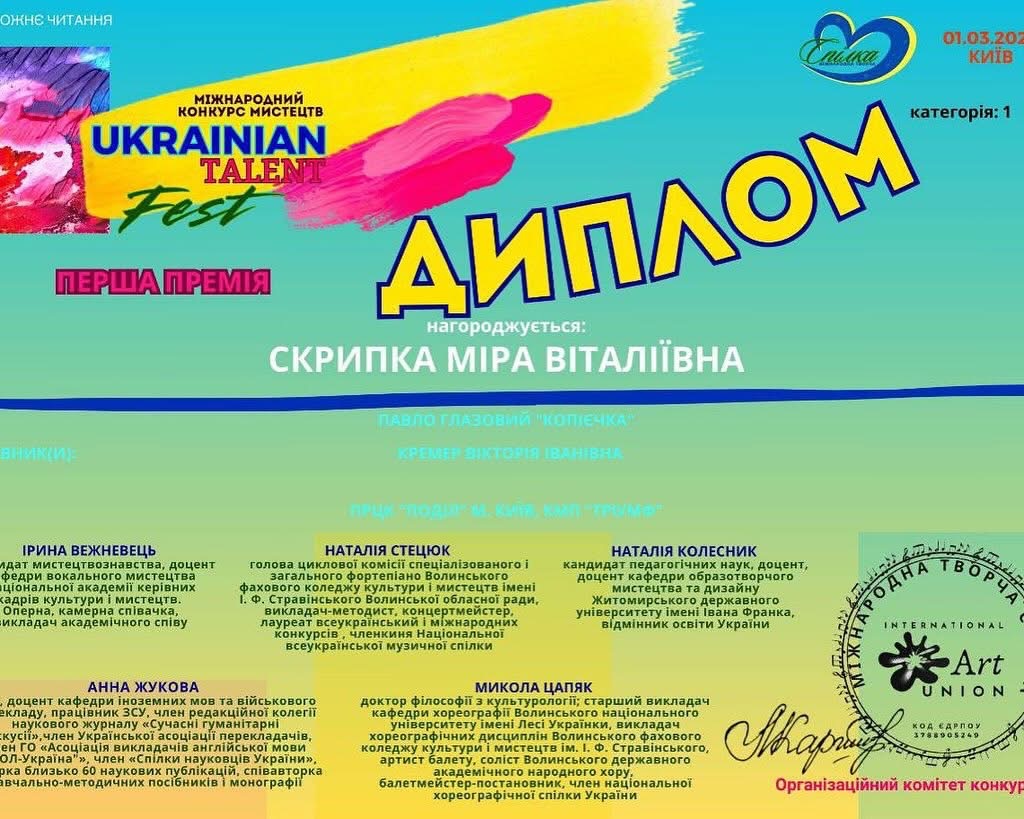 Вітаємо Міру Скрипку з І премією у міжнародному фестивалі конкурсі мистецтв «Ukrainian talent»🌸