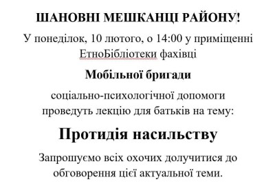 У понеділок, 10 лютого, о 14:00 у приміщенні ЕтноБібліотеки фахівці Мобільної бригади соціально-психологічної допомоги проведуть лекцію для батьків на тему: "Протидія насильству".