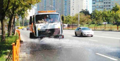У зв’язку зі спекотною погодою комунальні підприємства корпорації «Київавтодор» у посиленому режимі здійснюють полив доріг міста. Такі профілактичні заходи сприяють як зменшенню випарів шкідливих речовин від гарячого асфальтобетону у повітря, так і збереженню дорожнього полотна.