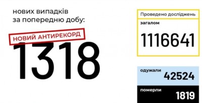 В Україні зафіксовано 1318 нових випадків коронавірусної хвороби COVID-19 — це антирекорд з кількості захворівших на добу