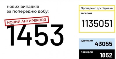В Україні зафіксовано 1453 нові випадки коронавірусної хвороби COVID-19 — це антирекорд з кількості нових хворих за добу
