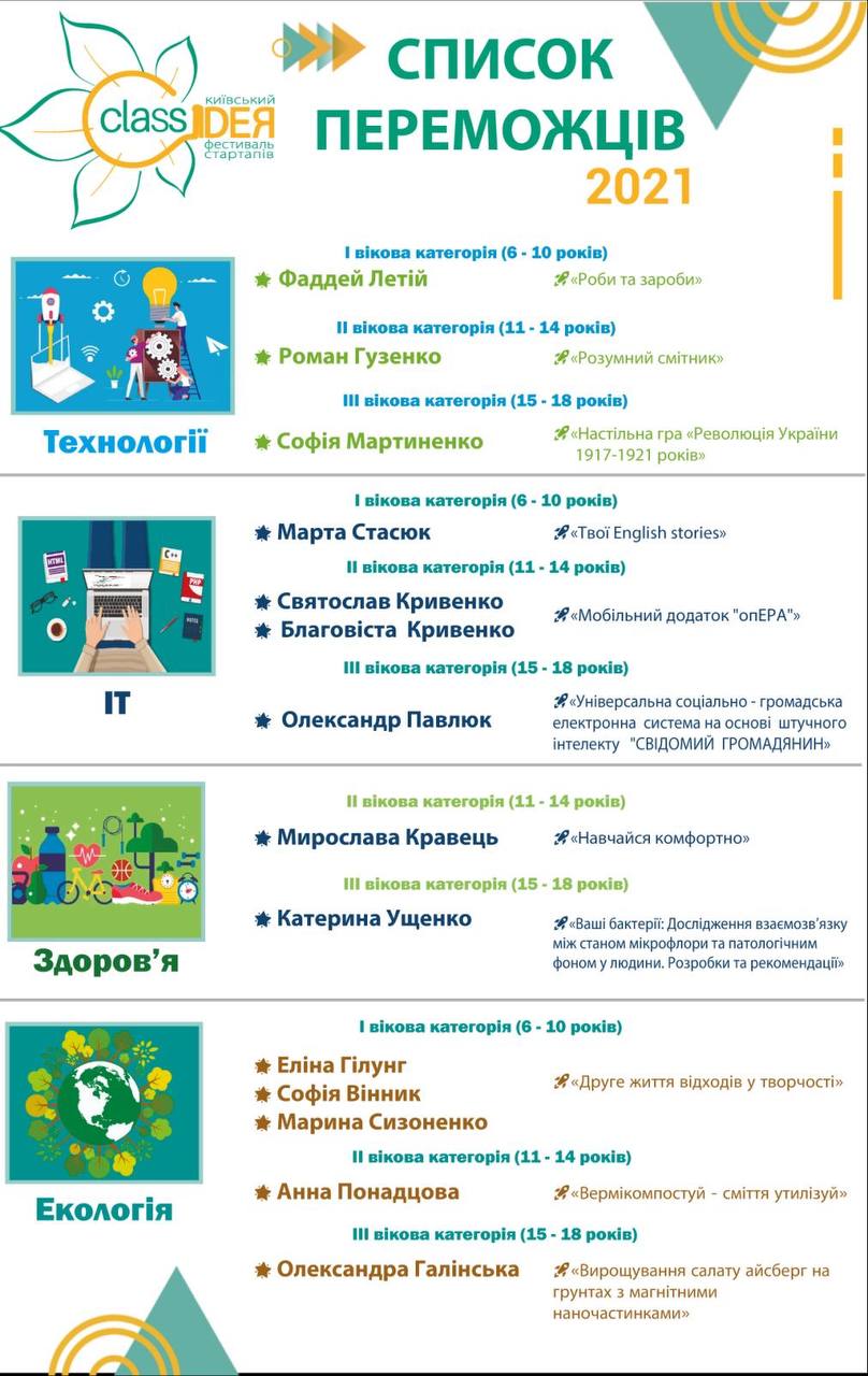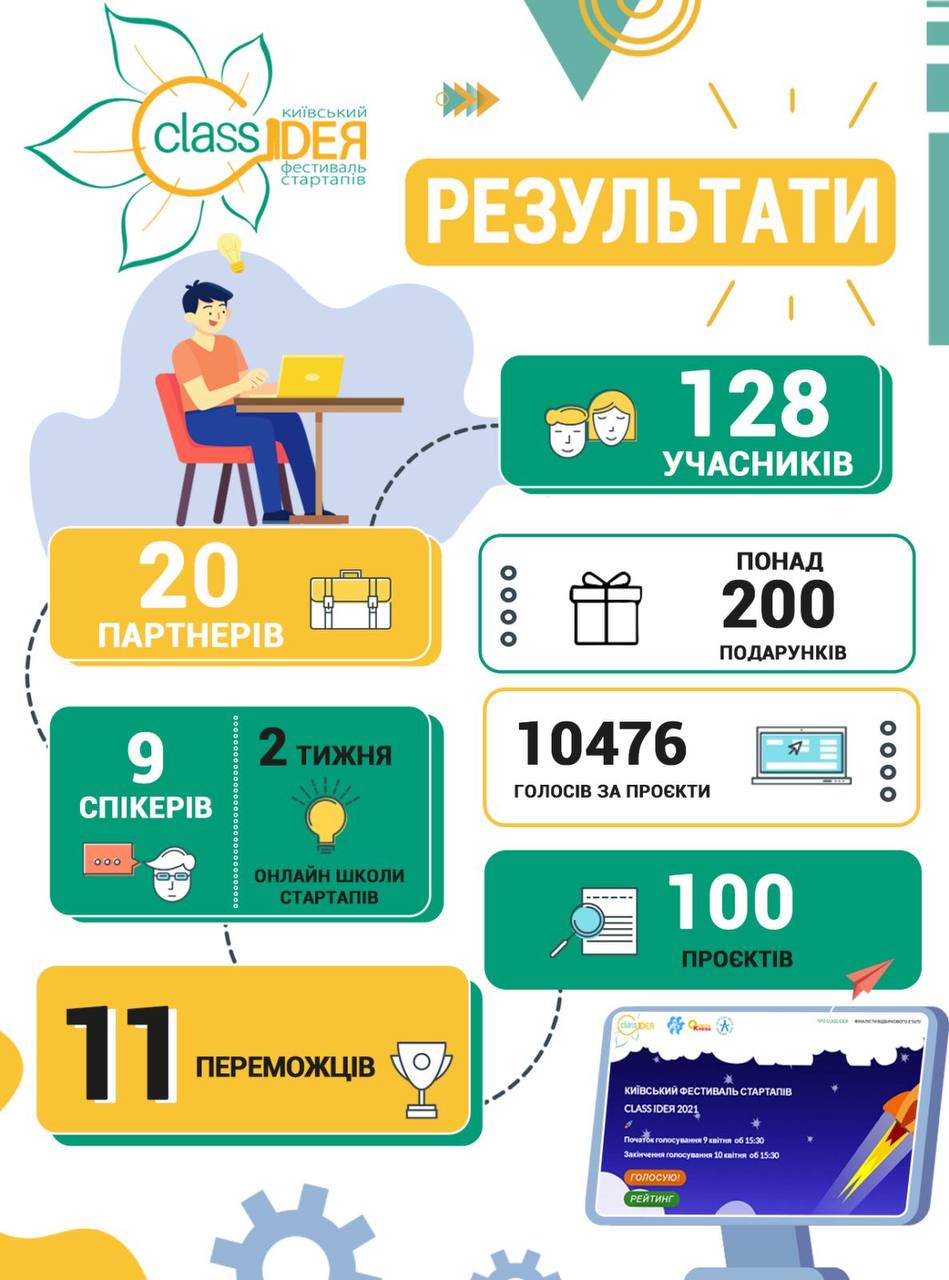 Переможцями Київського фестивалю стартапів «Class ідея-2021» за результатами електронного голосування стали наступні проєкти.