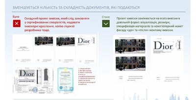Раніше підприємцям потрібен був проект вивіски. Його замовляли у сертифікованих спеціалістів, надавали інженерні креслення, копію ліцензії розробника тощо. Зі змінами проект вивіски замінюється на ЕСКІЗ вивіски, який подаватиметься в довільній формі: візуалізація, розміри, специфікація матеріалів та комп’ютерний макет фасаду «до-після» монтажу вивіски.