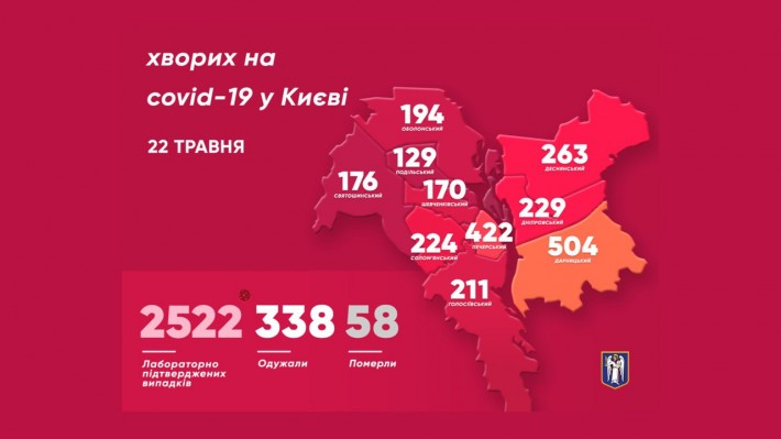 «Кількість мешканців Києва, у яких за минулу добу підтвердили захворювання на коронавірус, збільшилася на 47 людей. Серед них – 9 медиків. За минулу добу в столиці від коронавірусу померла одна людина. Усього за весь період – 58 летальних випадків. На сьогодні в столиці вже 2522 підтверджених випадки захворювання на COVID-19», – повідомив Віталій Кличко.
