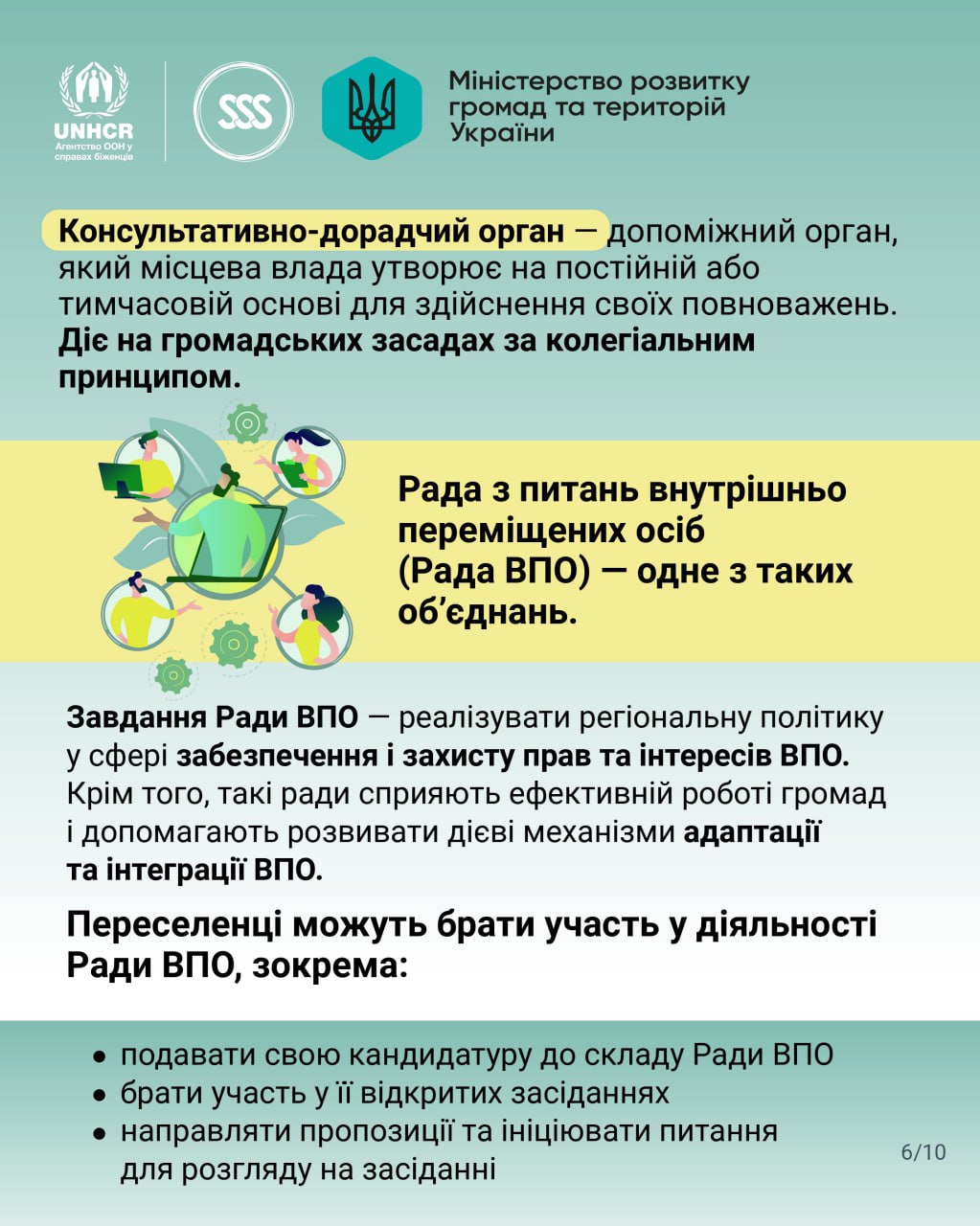 Важливу роль відіграють Ради ВПО – консультативні органи, які представляють інтереси переселенців і допомагають у питаннях їхньої інтеграції в громади.