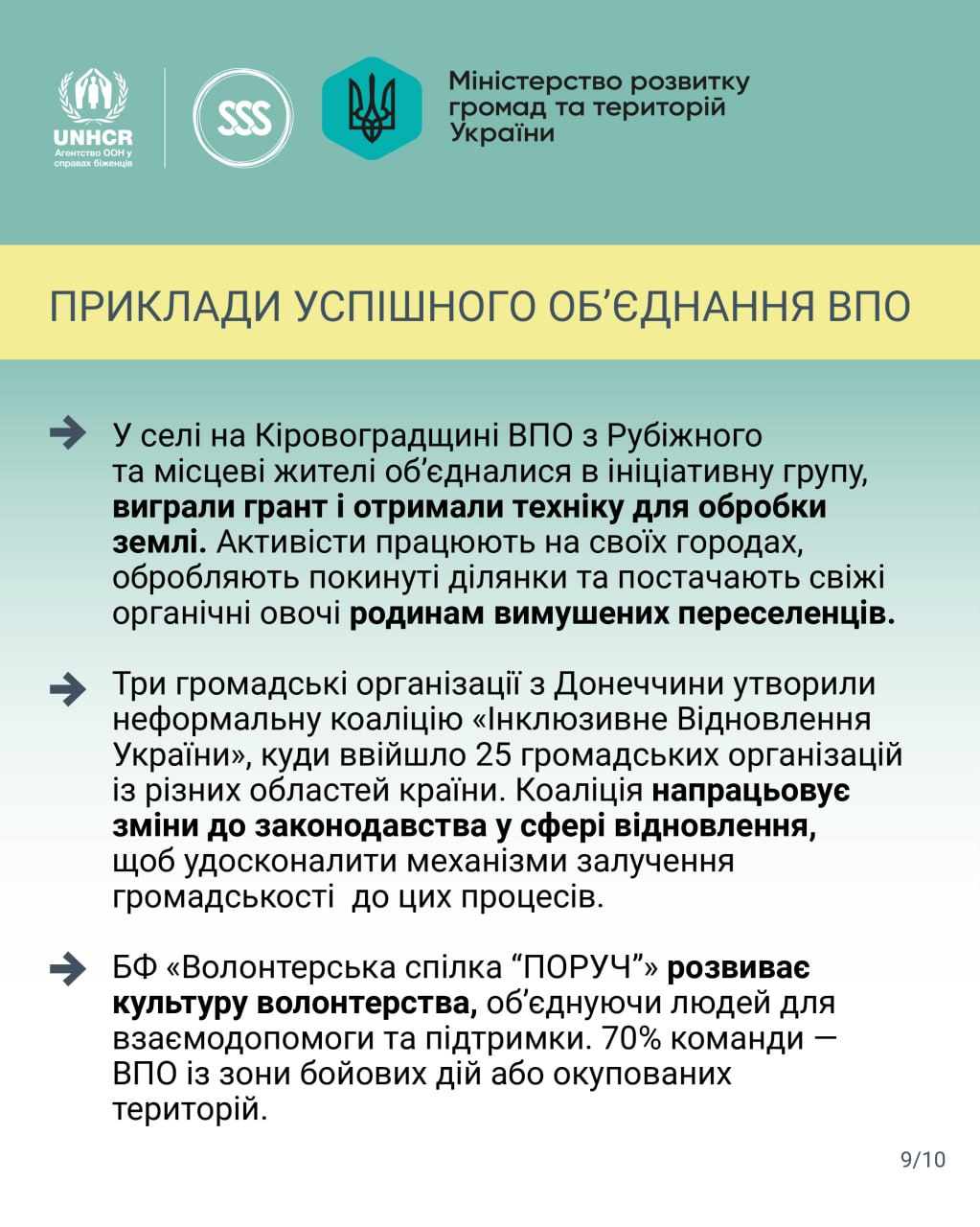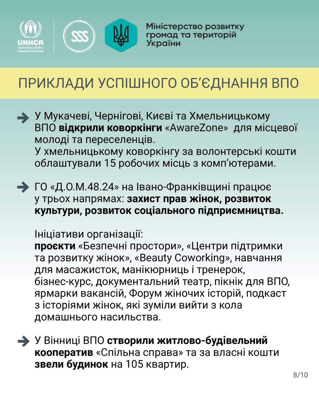 В Україні вже є приклади успішних ініціатив за участю переселенців: відкриття коворкінгів, створення житлових кооперативів, організація навчальних програм, соціальних підприємств та спільних проєктів для розвитку територій.
