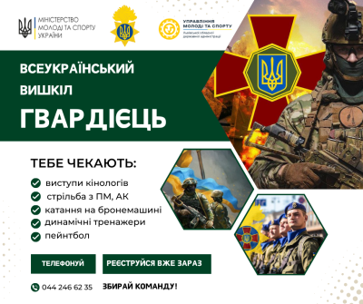 Міністерство молоді та спорту України спільно з Національною гвардією України та управлінням молоді та спорту Львівської обласної державної адміністрації запрошують до участі у Всеукраїнському вишколі «Гвардієць».