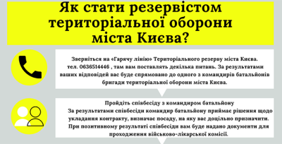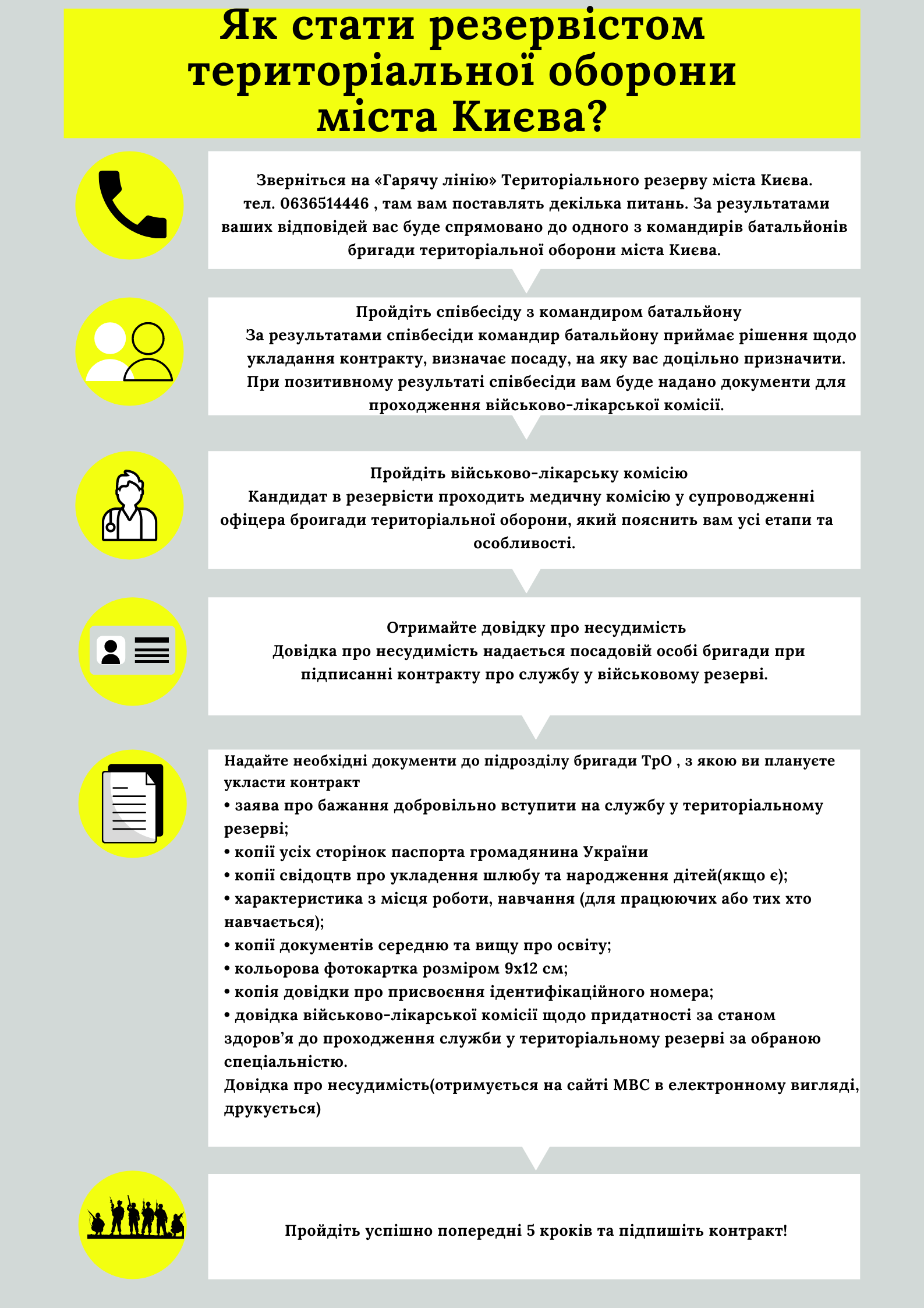З метою підвищення рівня обізнаності населення щодо того, як стати резервістом територіальної оборони міста Києва та чинних процедур укладання контракту до територіального резерву. Інформуємо про можливість вступу в ряди територіальної оборони.