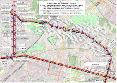 - тролейбусний маршрут № 94Н «Просп. Леся Курбаса – ст. м. «Площа Льва Толстого», організовується за трасою: просп. Леся Курбаса – Кільцева дорога – просп. Перемоги – вул. Д. Щербаківського – вул. Стеценка – вул. Щусєва – вул. Ю. Іллєнка – вул. Січових Стрільців – вул. В. Чорновола – просп. Перемоги – бульв. Т. Шевченка – вул. Велика Васильківська – ст. м. «Площа Льва Толстого» (у зворотному напрямку вул. Льва Толстого – вул. Володимирська – бульв. Тараса Шевченка).