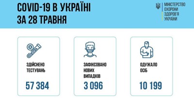 За даними Центру громадського здоров’я станом на 29 травня в Україні зафіксовано 3096 нових підтверджених випадків коронавірусної хвороби COVID-19