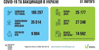 За добу 01 лютого 2022 року в Україні зафіксовано 35014 нових підтверджених випадків коронавірусної хвороби COVID-19
