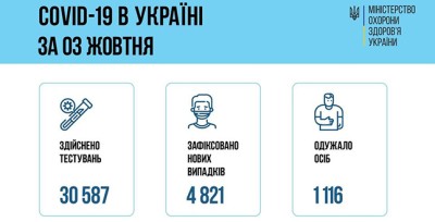 За добу 03 жовтня 2021 року в Україні зафіксовано 4 821 новий підтверджений випадок коронавірусної хвороби COVID-19