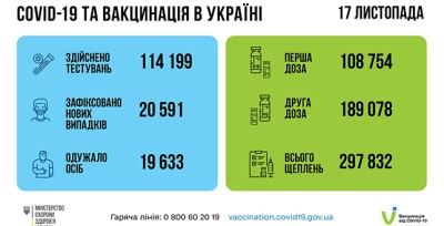За добу 17 листопада 2021 року в Україні зафіксовано 20591 нових підтверджених випадків коронавірусної хвороби COVID-19