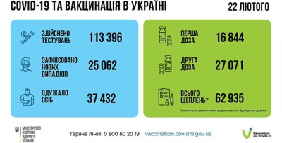 За добу 22 лютого 2022 року в Україні зафіксовано 25 062 нових підтверджених випадків коронавірусної хвороби COVID-19