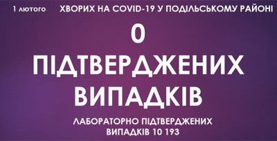 Станом на ранок 1 лютого, у Подільському районі зафіксовано 10 193 підтверджені випадки захворювання на коронавірусну інфекцію, за минулу добу не підтвердився жодний новий випадок захворювання на COVID-19.
