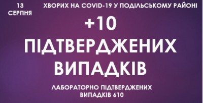 Станом на ранок 13 серпня у Подільському районі зафіксовано 610 підтверджених випадків захворювання на коронавірусну інфекцію, з них 10 за минулу добу.
