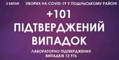 Станом на ранок 2 квітня, у Подільському районі зафіксовано 12 976 підтверджених випадків захворювання на коронавірусну інфекцію, з них 101 за минулу добу.