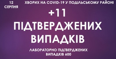 Станом на ранок 12 серпня у Подільському районі зафіксовано 600 підтверджених випадків захворювання на коронавірусну інфекцію, з них 11 за минулу добу.