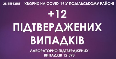 Станом на ранок 28 березня, у Подільському районі зафіксовано 12 593 підтверджені випадки захворювання на коронавірусну інфекцію, з них 12 за минулу добу.