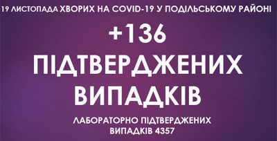 Станом на ранок 19 листопада, у Подільському районі зафіксовано 4357 підтверджених випадків захворювання на коронавірусну інфекцію, з них 136 за минулу добу.