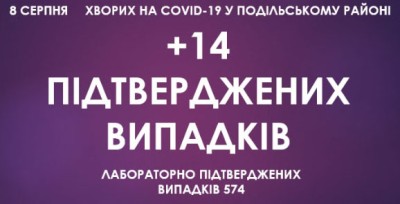 Станом на ранок 8 серпня у Подільському районі зафіксовано 574 підтверджені випадки захворювання на коронавірусну інфекцію, з них 14 за минулу добу.