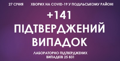 Станом на ранок 27 січня, у Подільському районі зафіксовано 25 831 підтверджений випадок захворювання на коронавірусну інфекцію, з них 141 за минулу добу.