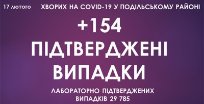 Станом на ранок 17 лютого, у Подільському районі зафіксовано 29 785 підтверджених випадків захворювання на коронавірусну інфекцію, з них 154 за минулу добу.
