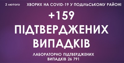 Станом на ранок 2 лютого, у Подільському районі зафіксовано 26 791 підтверджений випадок захворювання на коронавірусну інфекцію, з них 159 за минулу добу.