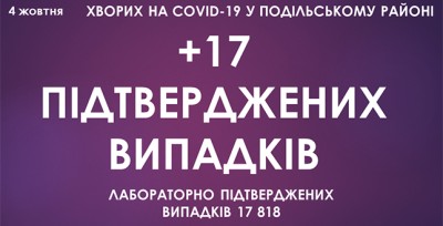 Станом на ранок 4 жовтня, у Подільському районі зафіксовано 17 818 підтверджених випадків захворювання на коронавірусну інфекцію, з них 17 за минулу добу.