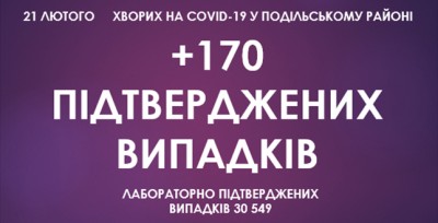 Станом на ранок 21 лютого, у Подільському районі зафіксовано 30 549 підтверджених випадків захворювання на коронавірусну інфекцію, з них 170 за минулу добу.