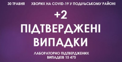 Станом на ранок 30 травня, у Подільському районі зафіксовано 15 475 підтверджених випадків захворювання на коронавірусну інфекцію, з них 2 за минулу добу.