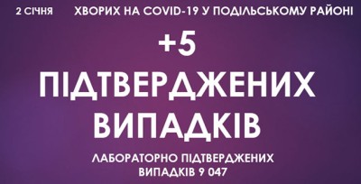 Станом на ранок 2 січня, у Подільському районі зафіксовано 9 047 підтверджених випадків захворювання на коронавірусну інфекцію, з них 5 за минулу добу.