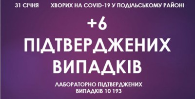 Станом на ранок 31 січня у Подільському районі зафіксовано 10 193 підтверджені випадки захворювання на коронавірусну інфекцію, з них 6 за минулу добу.