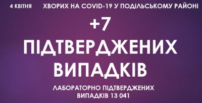 Станом на ранок 4 квітня, у Подільському районі зафіксовано 13 041 підтверджений випадок захворювання на коронавірусну інфекцію, з них 7 за минулу добу.